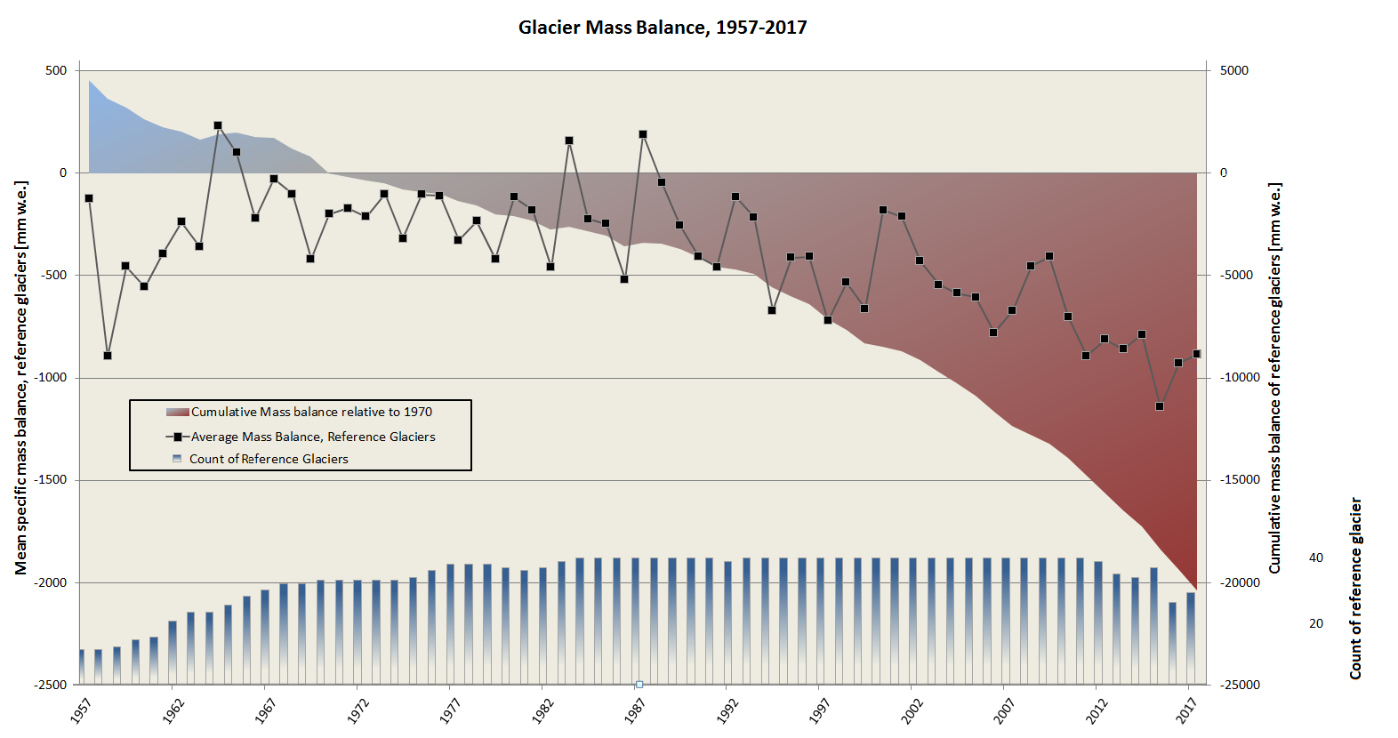Glacier Mass Balance![]() ![]() Glacier mass balance data were provided by the World Glacier Monitoring Service (WGMS). Mass balance values in mm water equivalent. Note that 'reference' glaciers are those with long-term observation series, i.e. > 30 years. All but one of reference glaciers are in the Northern Hemisphere. Reference: WGMS (2012): Fluctuations of Glaciers 2005-2010 (Vol. X): Zemp, M., Frey, H., Gärtner-Roer, I., Nussbaumer, S.U., Hoelzle, M., Paul, F. & W. Haeberli (eds.), ICSU (WDS)/ IUGG (IACS)/ UNEP/ UNESCO/ WMO, World Glacier Monitoring Service, Zurich, Switzerland. Based on database version doi: 10.5904/wgms-fog-2012-11. |